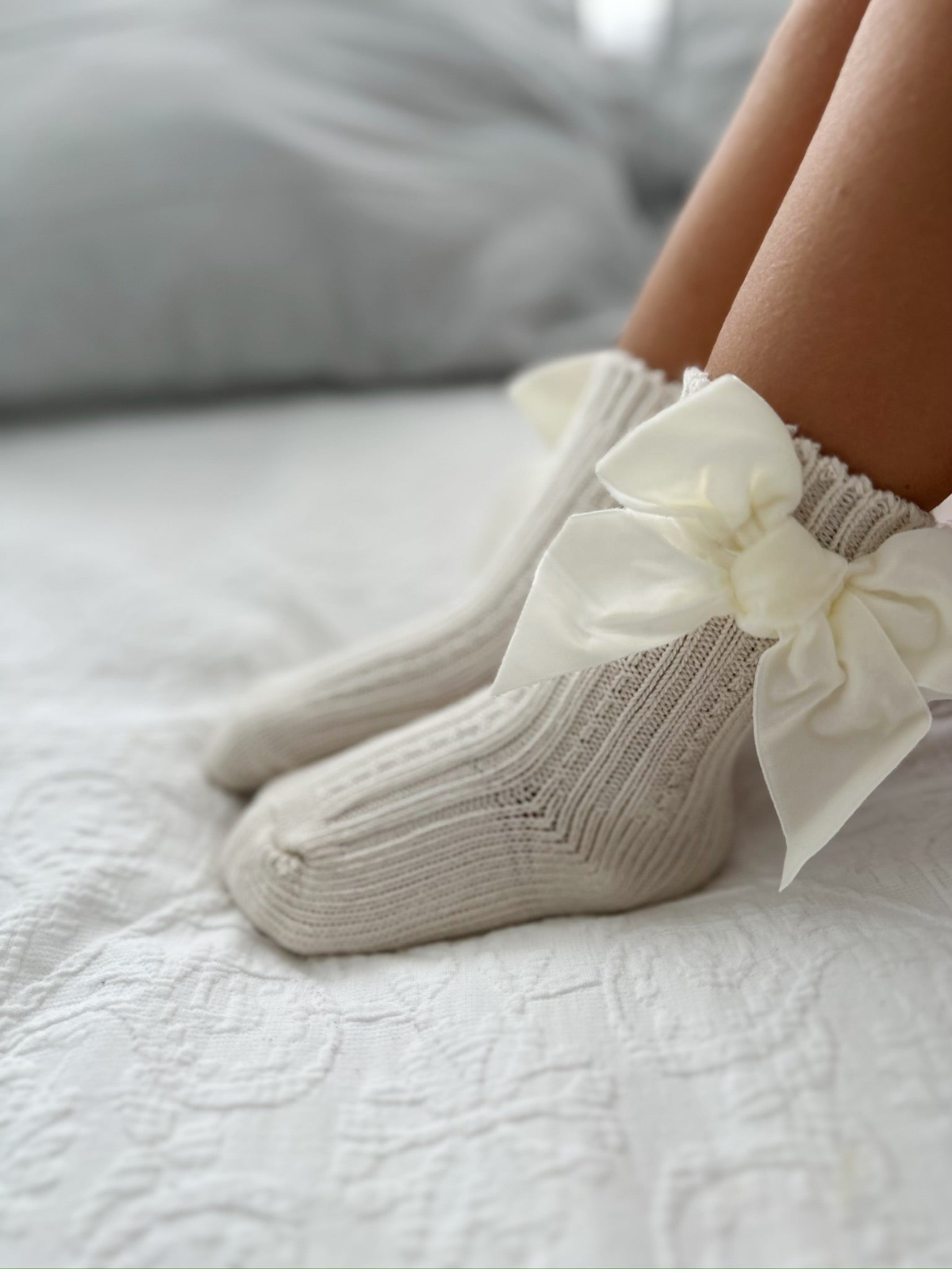 Add a touch of elegance to your little one’s outfit with our sweet Milky Mae Bow socks. Made from soft, breathable fabric, these socks feature a delicate ribbed texture for a comfortable fit. Each pair is beautifully adorned with luxurious velvet bows in a soft cream tone, perfect for special occasions or everyday style. Designed to stay snug and stylish, they are ideal for your little one’s feet.